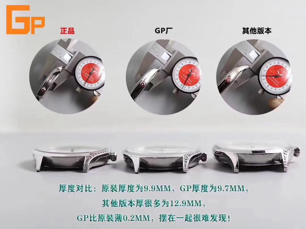 目前GP厂新年首发这款腕表的复刻版本,原版1:1开模,将这枚腕表时尚气息诠释的淋漓尽致,精致不失高贵,俘虏女神芳心!GP厂这款碟飞表壳是由GP制表师精选316L钢打造而成,尺寸36*9.7mm,沿表壳曲线呈69式镶嵌38颗施华洛世奇水晶钻,表耳内侧遵循原版打有产品流水编号,可谓一表一号,搪瓷表盘,其工艺同原装一致,处理透明浮层,使整个表盘晶莹剔透,环绕转印蓝色罗马数字,且表盘边缘做了压弯处理!