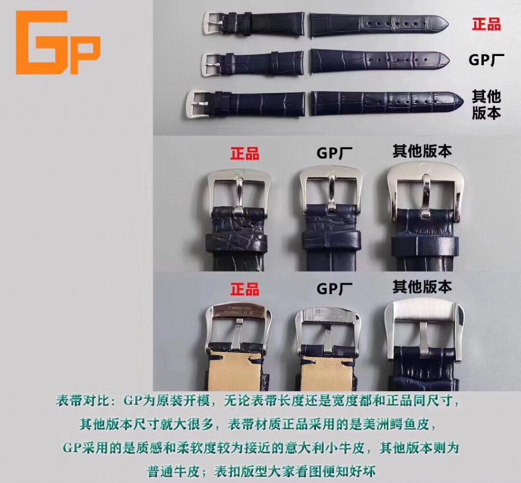 GP此次发布的了两个机芯版本,一种为原装Cal.4061型石英机芯版本;另一种则为瑞士朗达Cal.772机石英机芯版本!表带采用的是质感和柔软度较好意大利小牛皮,并有同等原版的绢丝表带供各位女神选择,下面骨灰级复刻玩家为大家做详细对比正品评测: